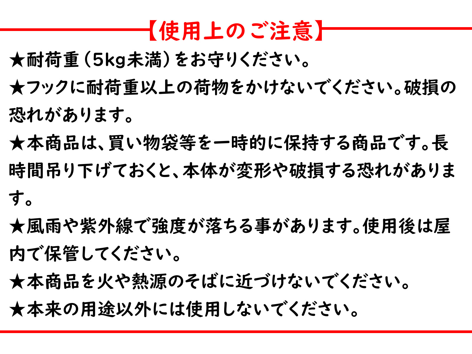 ★本商品は、買い物袋等を一時的に保持する商品です。長時間吊り下げておくと、本体が変形や破損する恐れがあります。