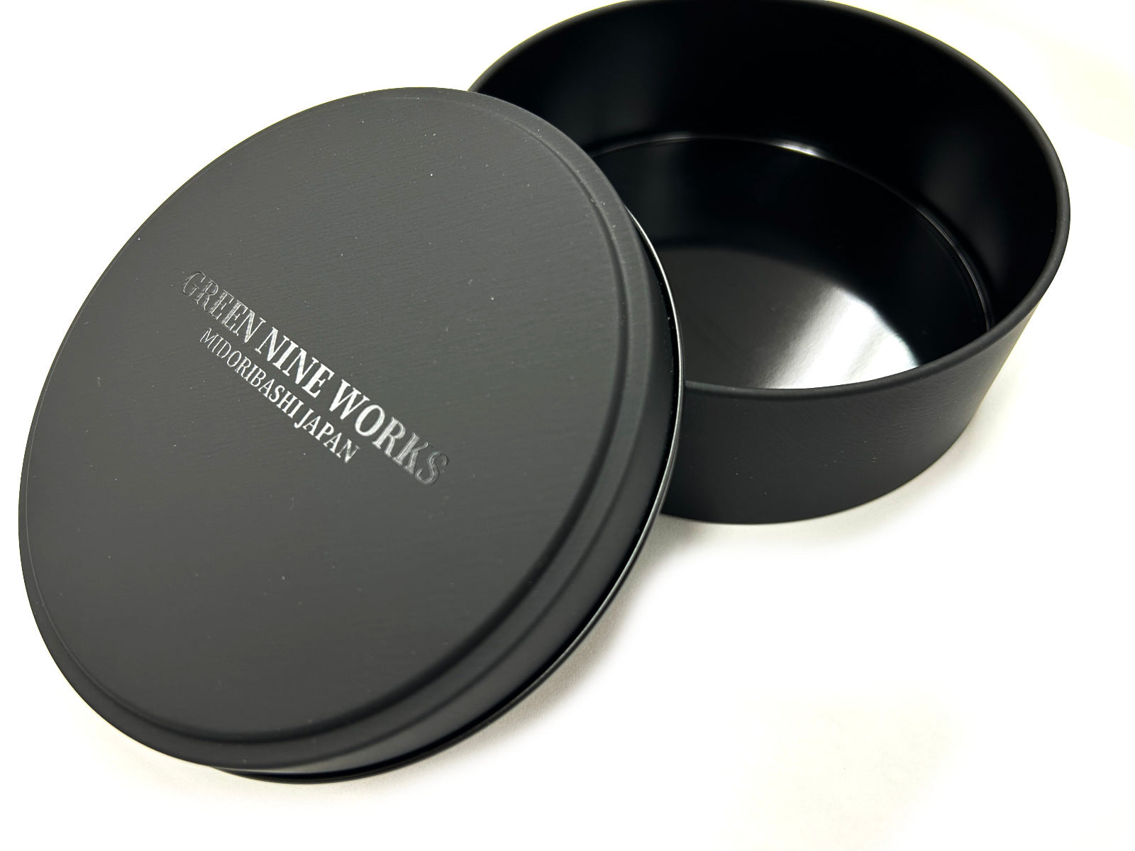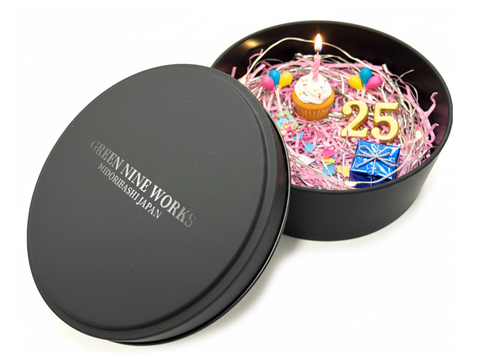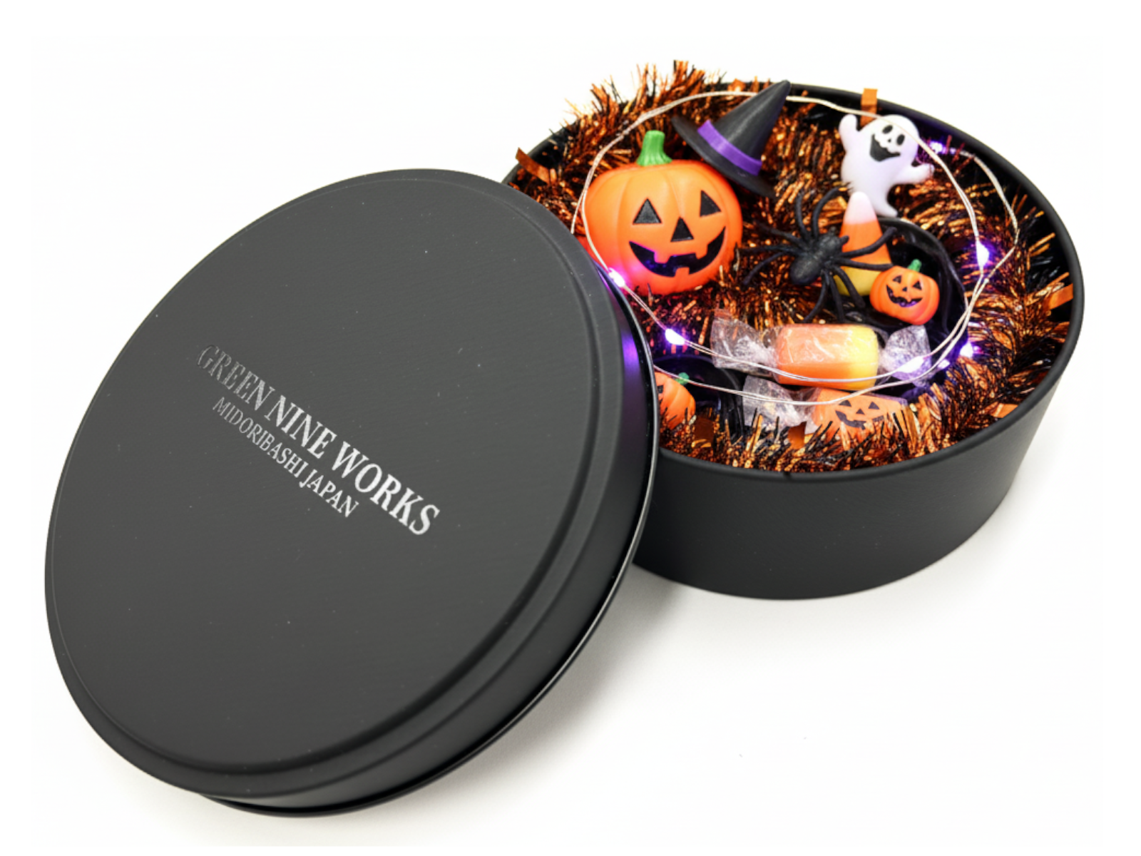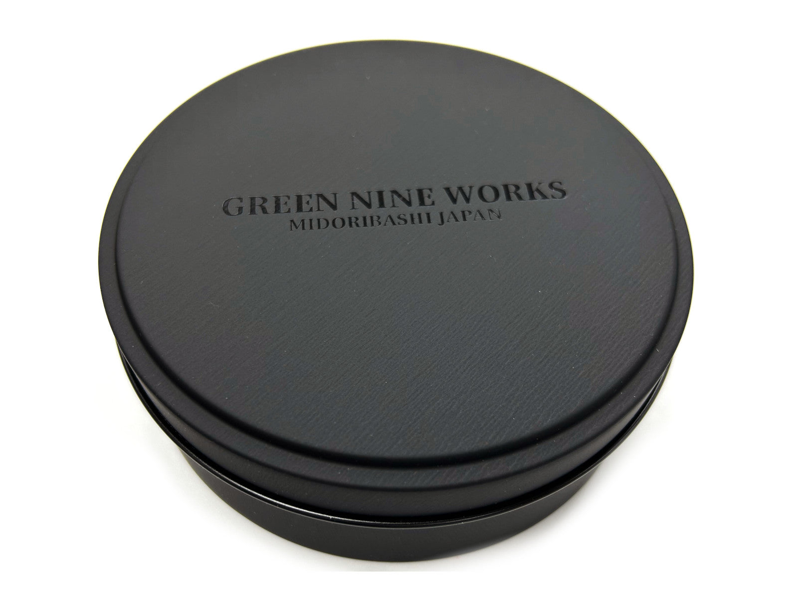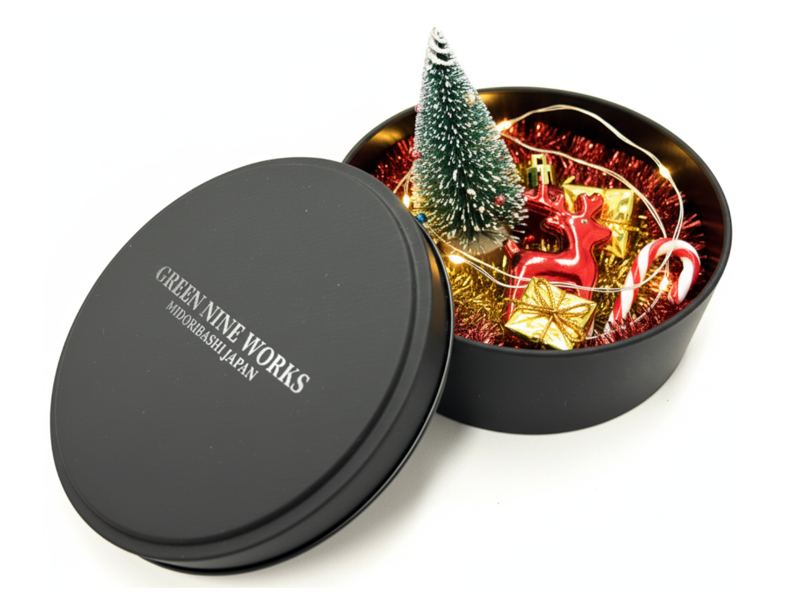 高級感のあるマットなブラックの丸い缶で、ふたには透明インク(メジューム)で”GREEN NINE WORKS”の自社オリジナルブランドロゴをプリントし、さりげないがオシャレでクールな高級感のあるギフト缶に仕上げています。