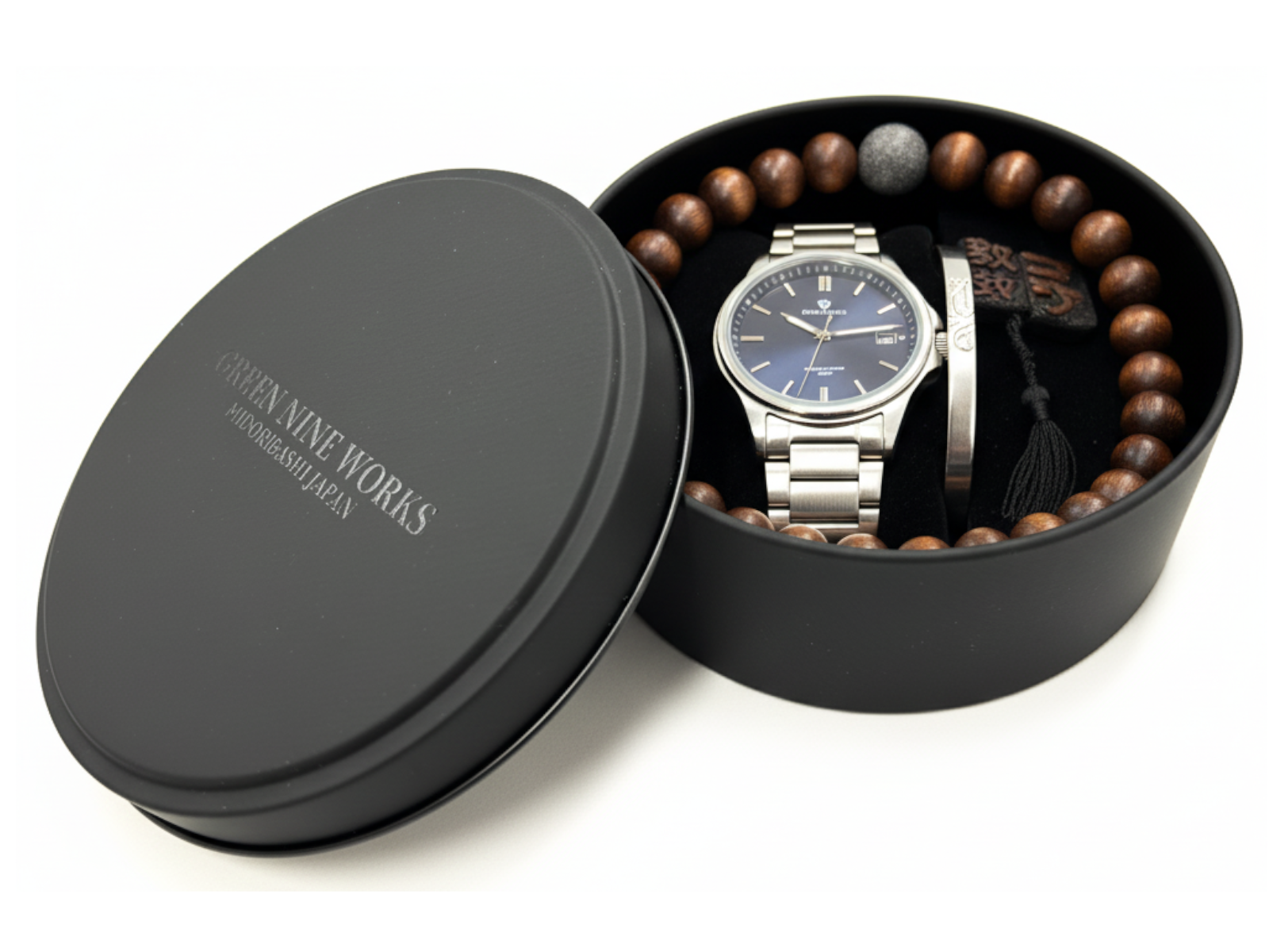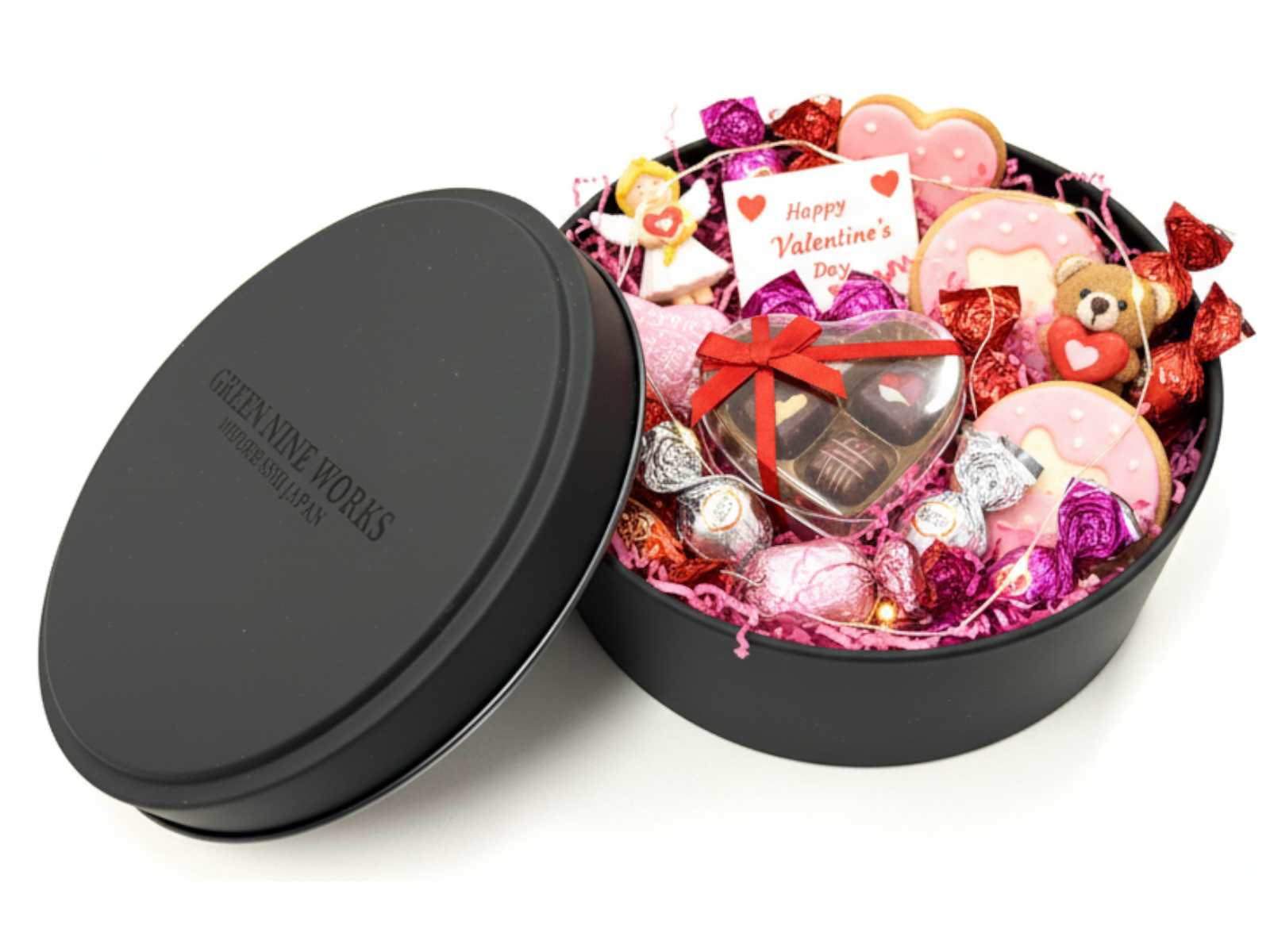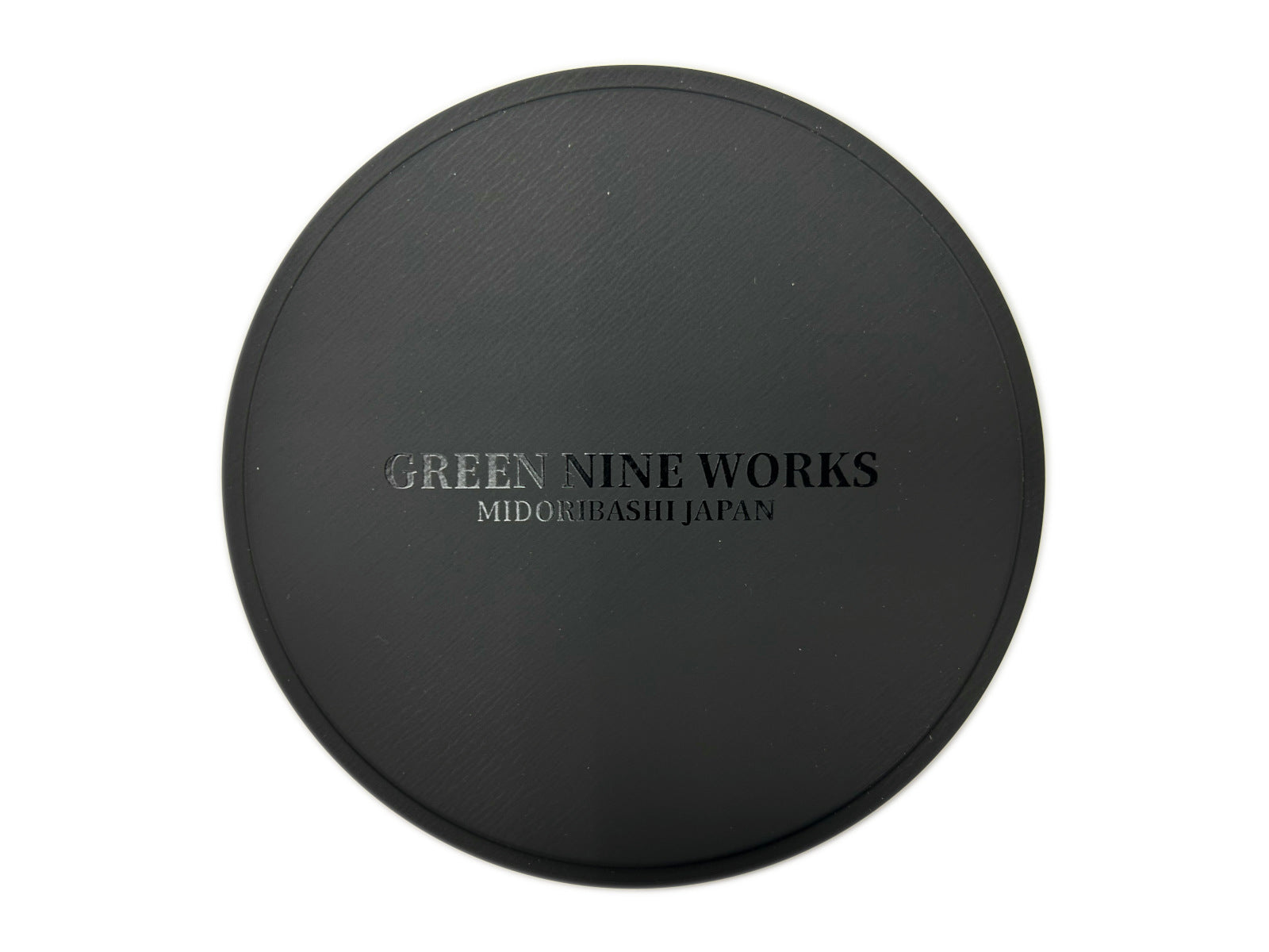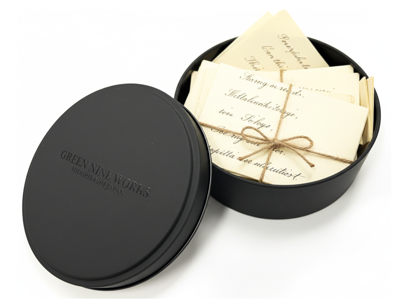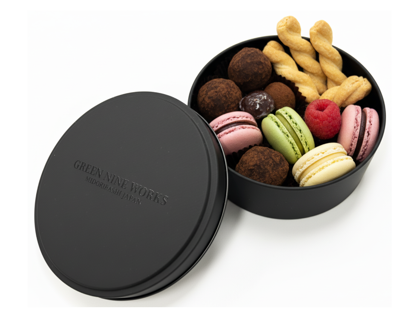 高級感のあるマットなブラックの丸い缶で、ふたには透明インク(メジューム)で”GREEN NINE WORKS”の自社オリジナルブランドロゴをプリントし、さりげないがオシャレでクールな高級感のあるギフト缶に仕上げています。