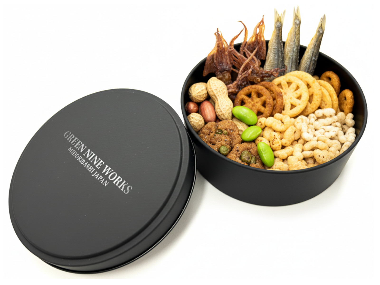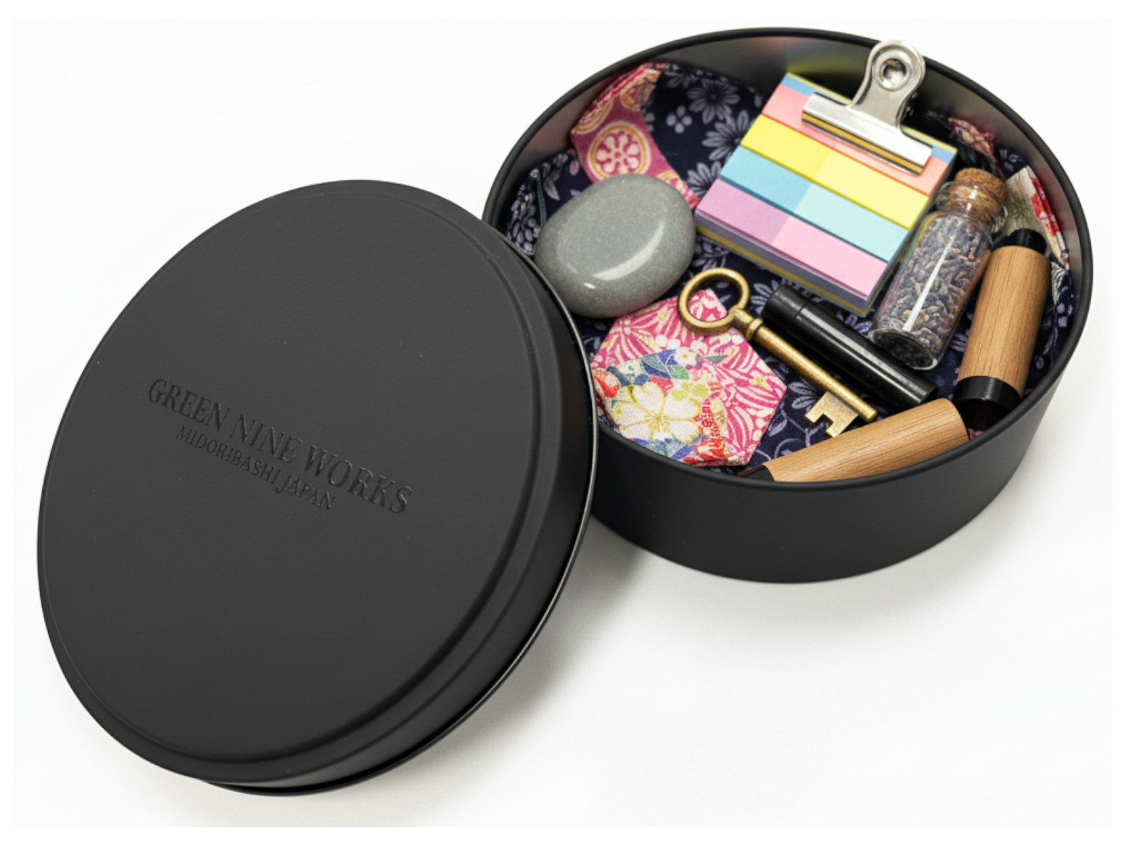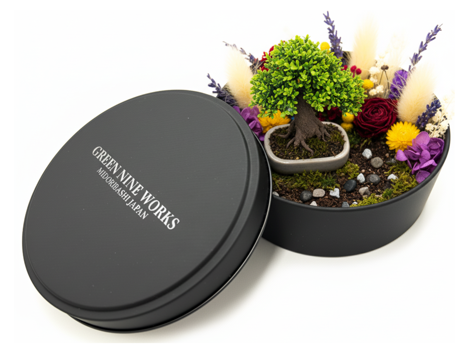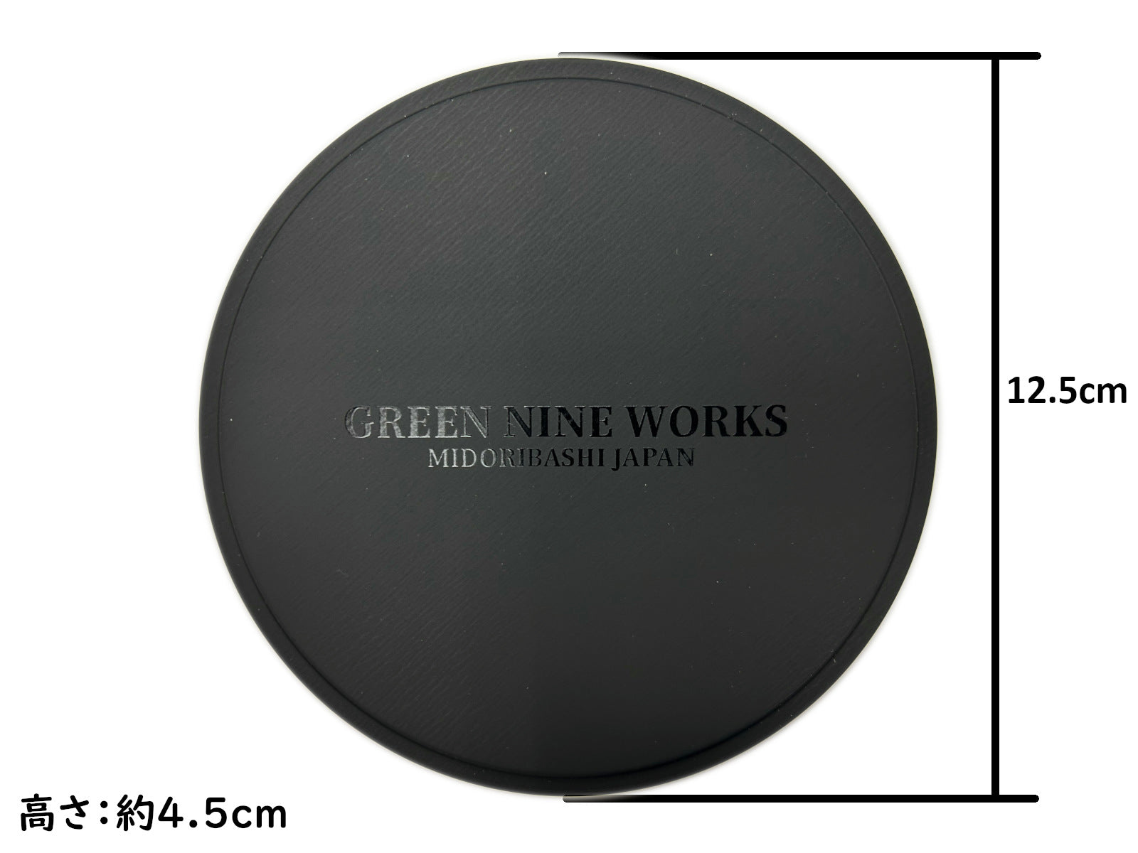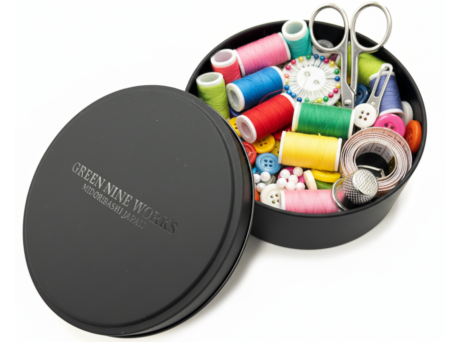 高級感のあるマットなブラックの丸い缶で、ふたには透明インク(メジューム)で”GREEN NINE WORKS”の自社オリジナルブランドロゴをプリントし、さりげないがオシャレでクールな高級感のあるギフト缶に仕上げています。