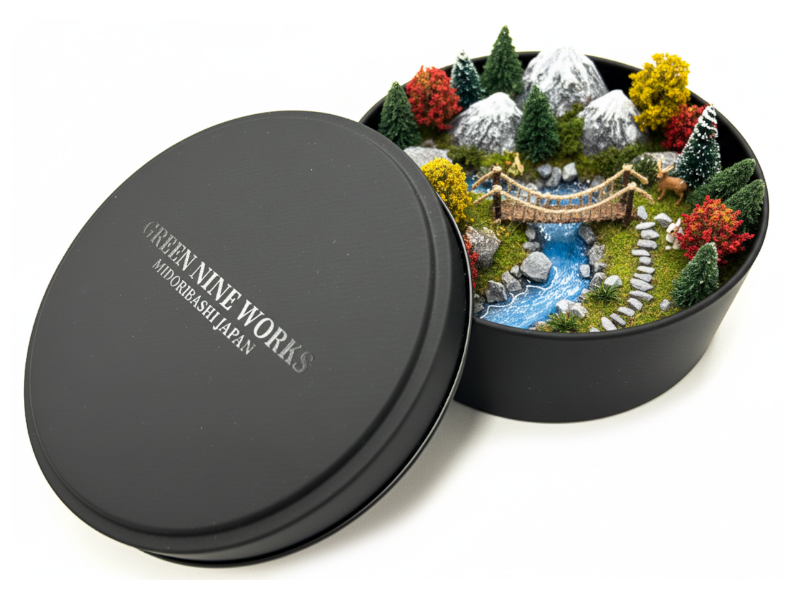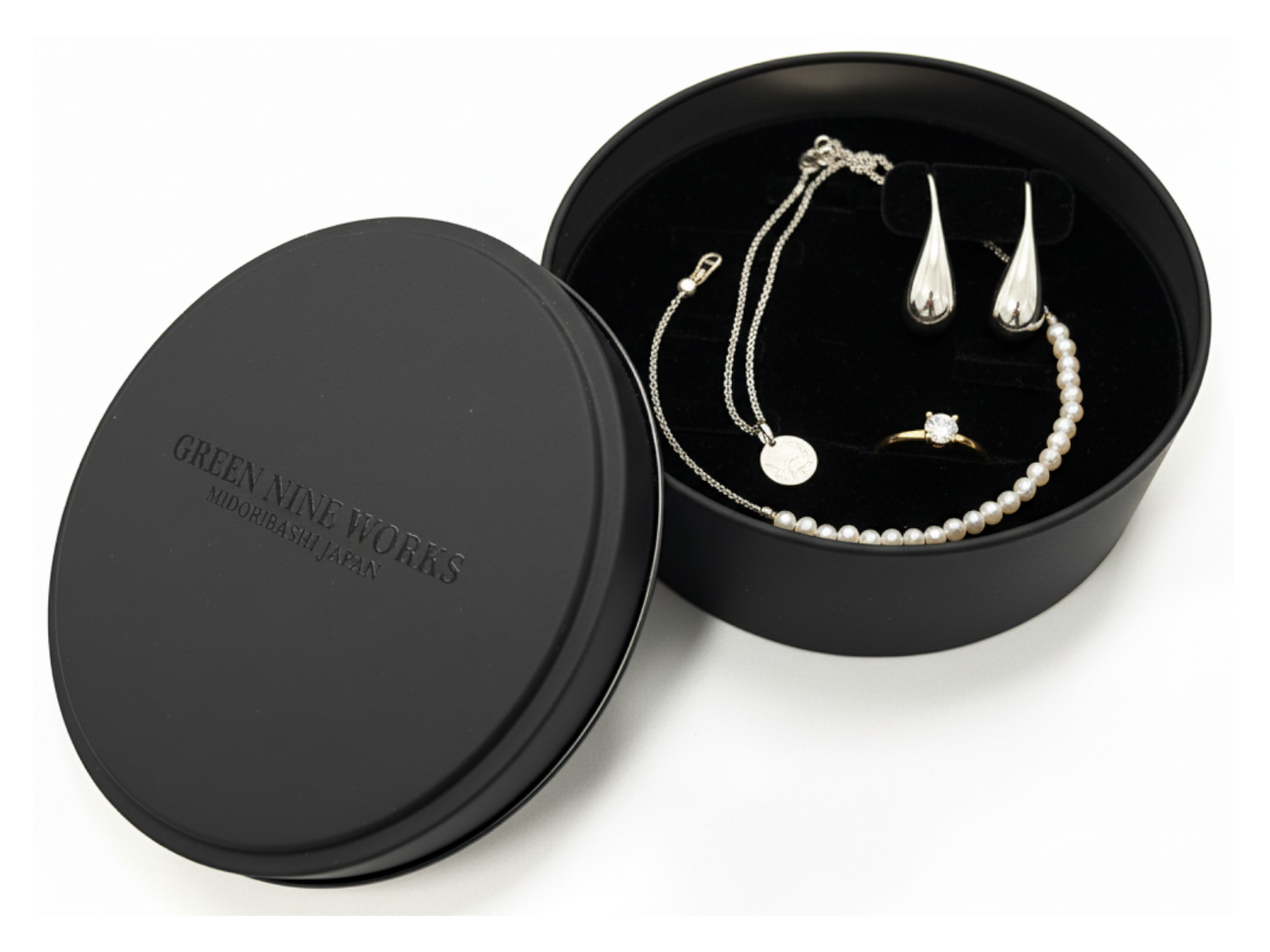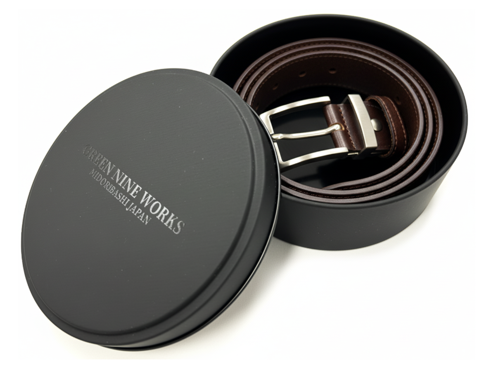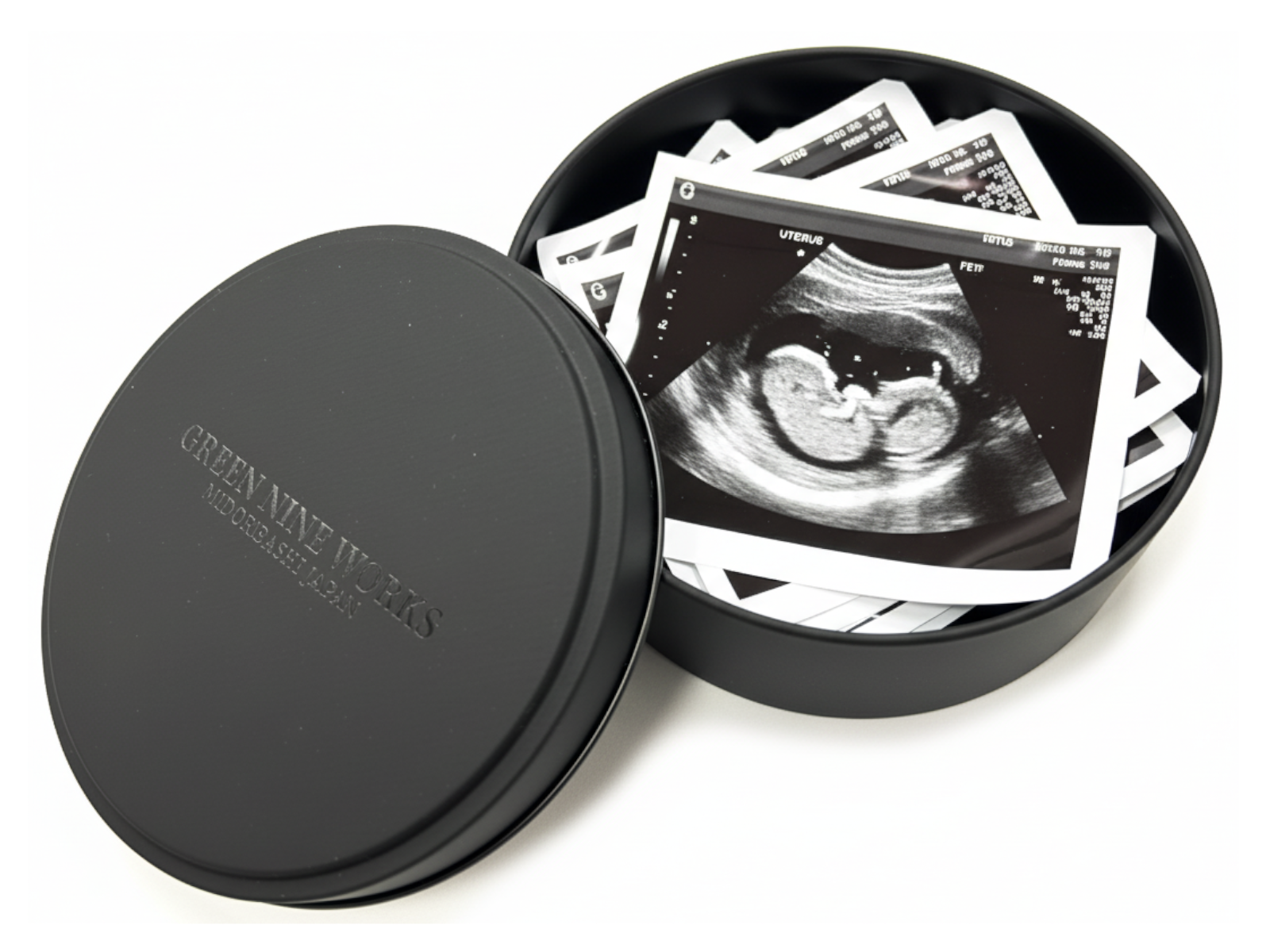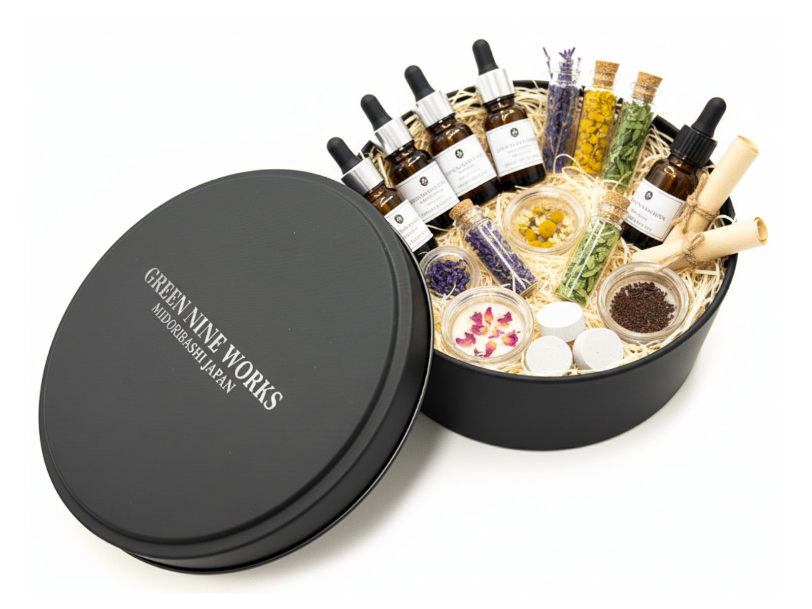 高級感のあるマットなブラックの丸い缶で、ふたには透明インク(メジューム)で”GREEN NINE WORKS”の自社オリジナルブランドロゴをプリントし、さりげないがオシャレでクールな高級感のあるギフト缶に仕上げています。